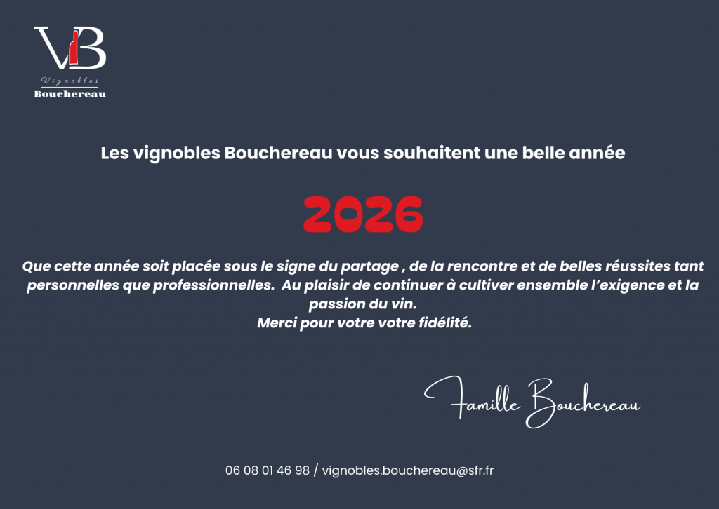 En ce début d’année nous tenions à vous présenter nos meilleurs voeux pour 2026 : santé , réussite et beaux moments de partageNous souhaitons également vous remercier très sincèrement pour votre confiance et votre fidélité. C’est grâce à vous que nous pouvons continuer à faire vivre notre métier avec passion et à élaborer des vins qui nous ressemblent, authentiques et fidèles à notre terroir.
